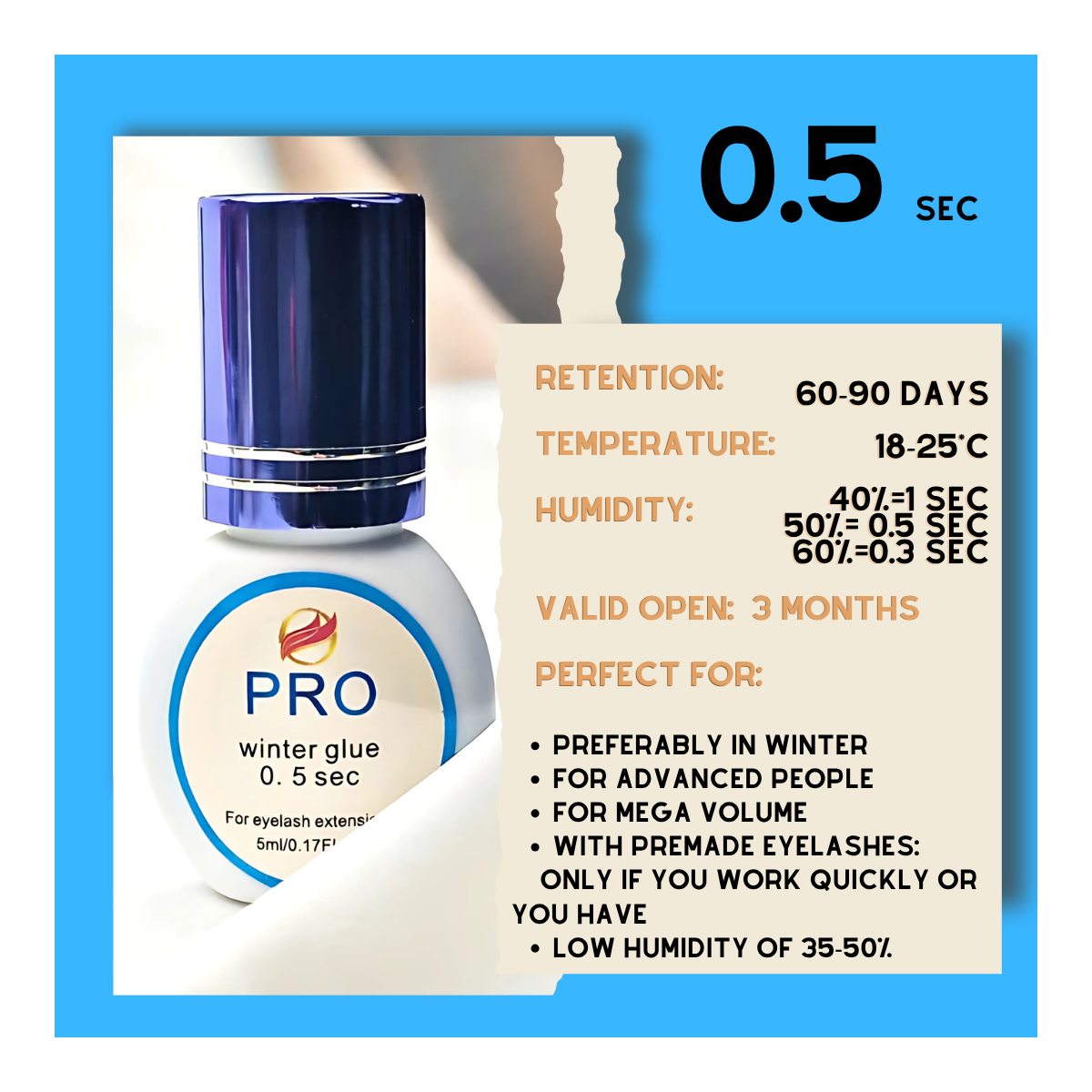 L'adesivo Standard asciuga 1 secondo: lo usi quando l'umidità è leggermente sotto il 55%, lavori con ciglia fino al 3D o prefatte (ready-made). È un adesivo con solo un livello di asciugatura più veloce ed è il livello successivo dopo Principiante. È la colla sicura che si abbina benissimo al Super Bonder standard di iBeauty nel caso in cui si voglia aumentare la velocità di lavoro.